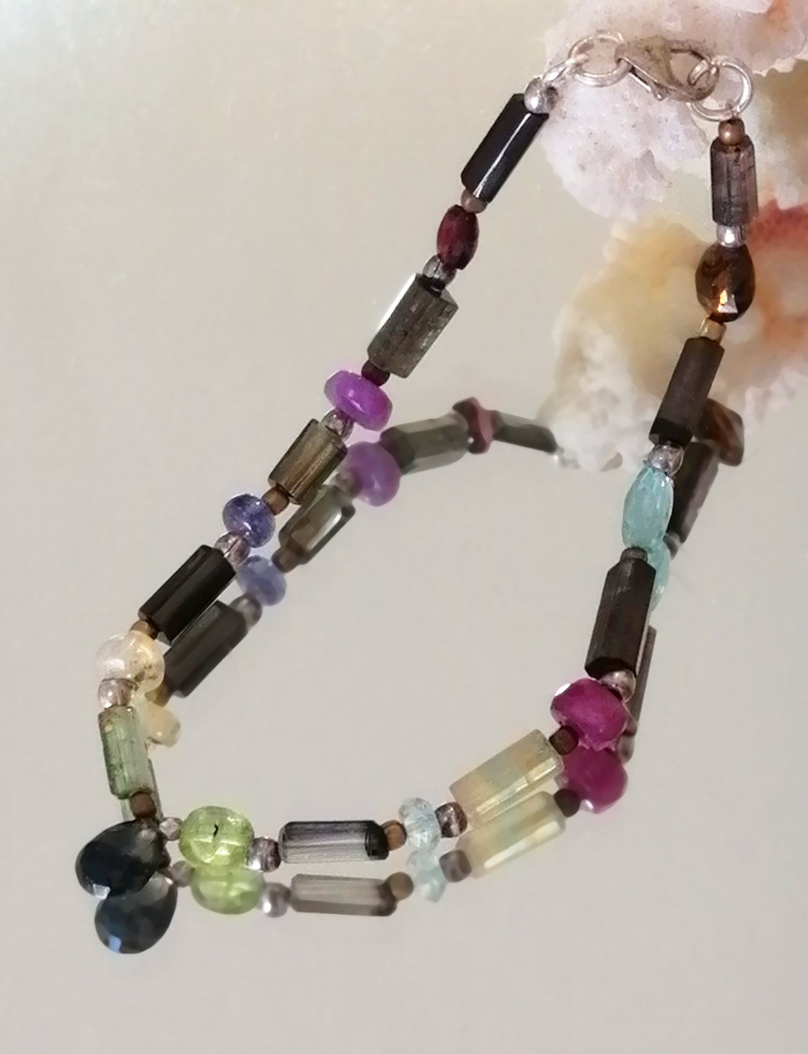 Pulsera de turmalina con toques de topacio azul, granate, rubí, olivino, zafiro y más
